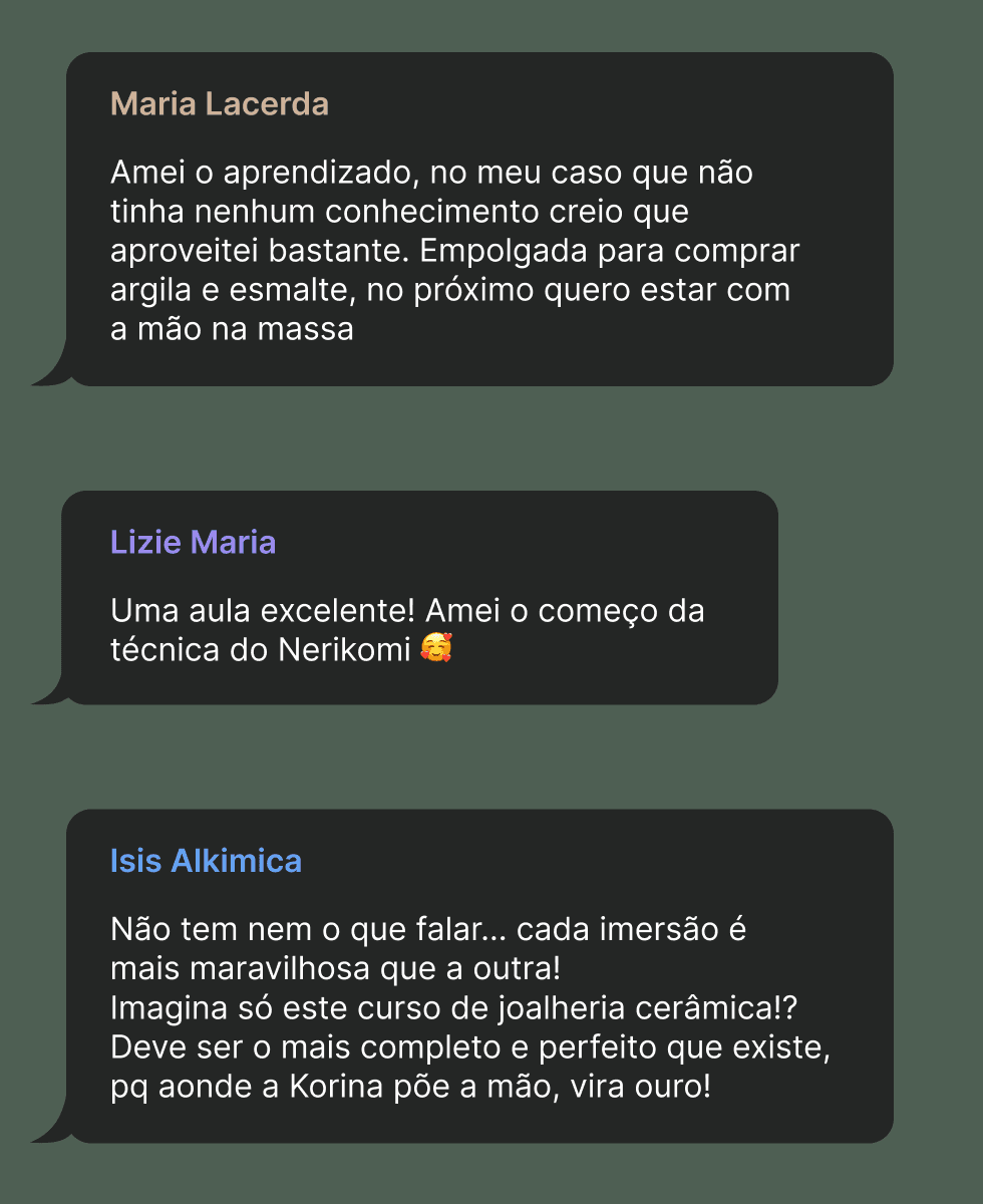 Aviso Legal: Não nos responsabilizamos pela aquisição de materiais e ferramentas, tão pouco pela produção, queima e montagem das peças. Todo o material produzido é de autoria do Studio Korina Costa e o uso ilegal dos mesmos será enquadrado nas leis pertinentes. Ao adquirir este ingresso declaro estar ciente das determinações legais e permito o uso da minha imagem e das peças desenvolvidas, para divulgação de marketing pelo Studio Korina Costa em suas redes sociais, cursos e demais materiais desenvolvidos.